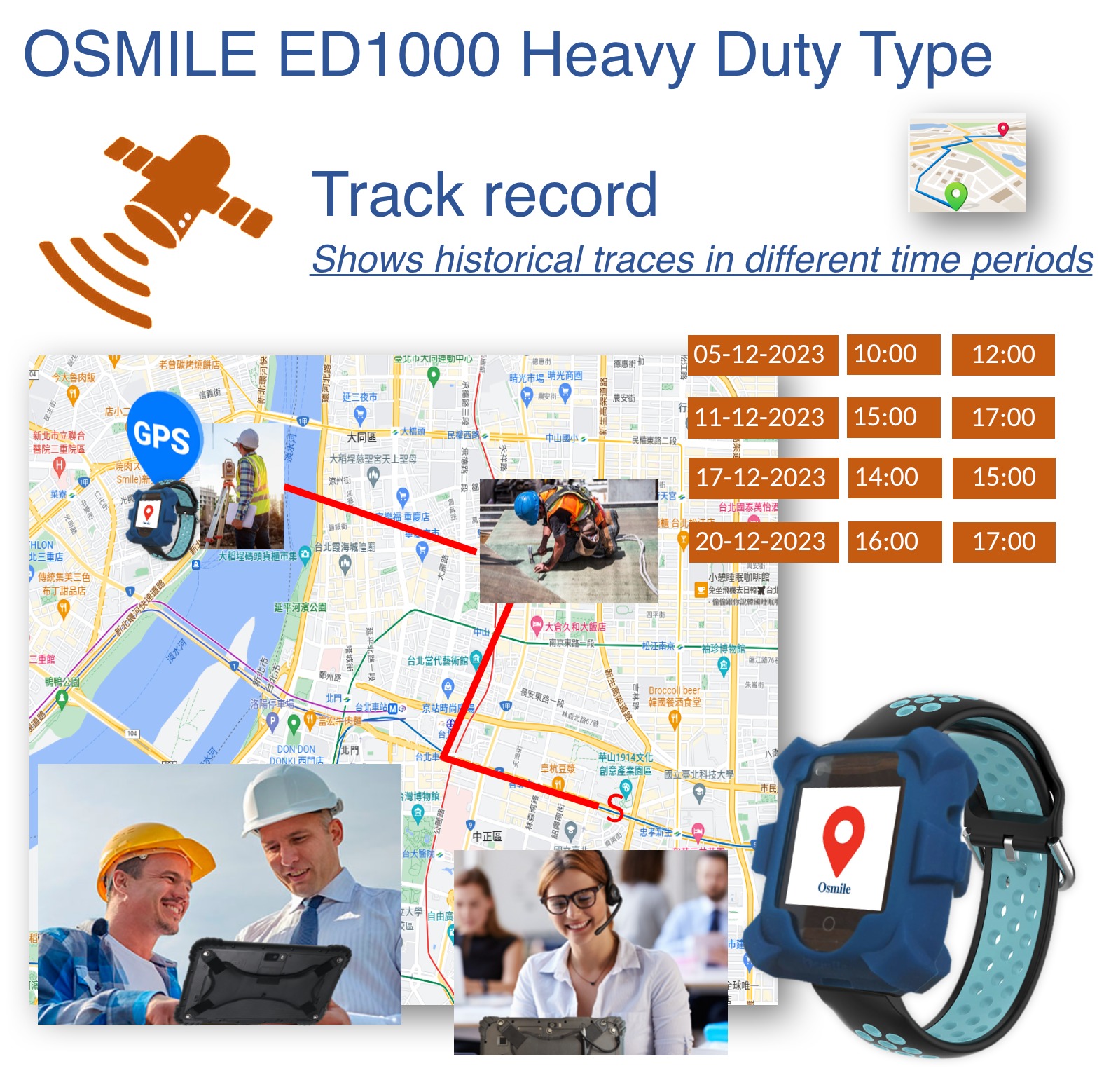 When using Osmile ED1000, the lone worker’s GPS location is reported to the system every ten minutes as standard (although this frequency can be customised), and whenever a SOS Aler or Worker Down Alert is raised.